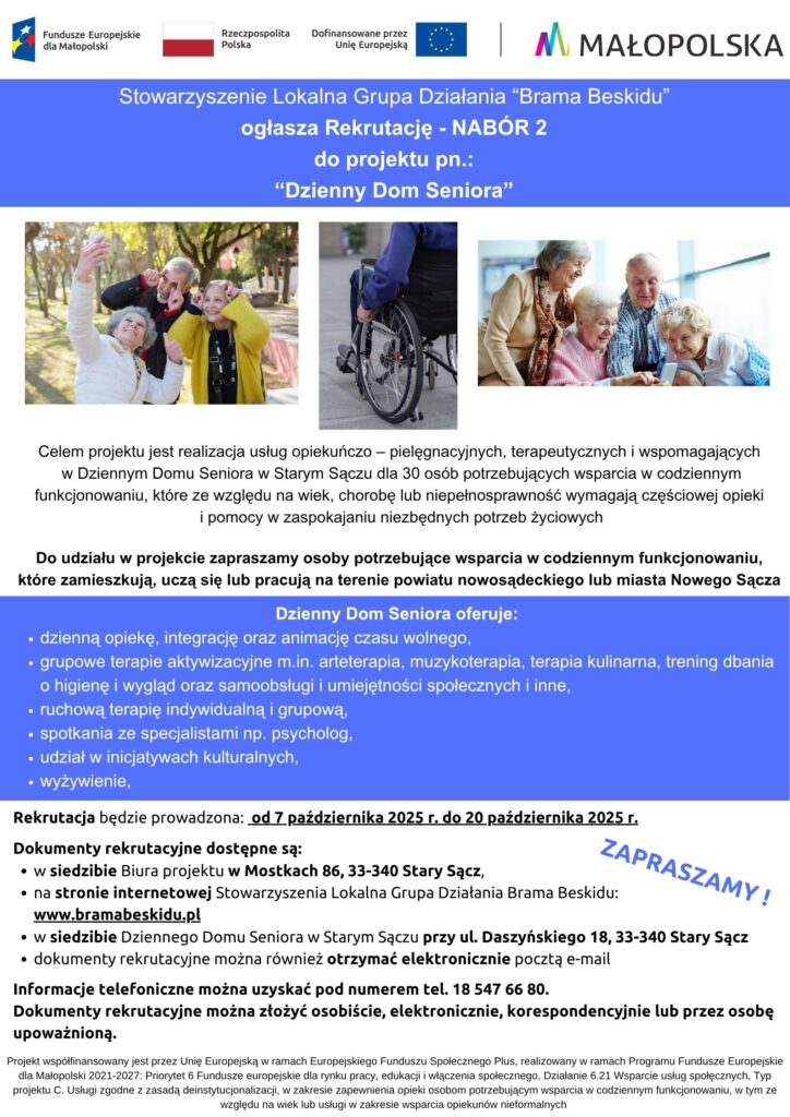 Stowarzyszenie Lokalna Grupa Działania „Brama Beskidu” ogłasza rekrutację do projektu pn. „Dzienny Dom Seniora”.