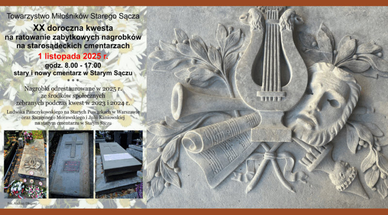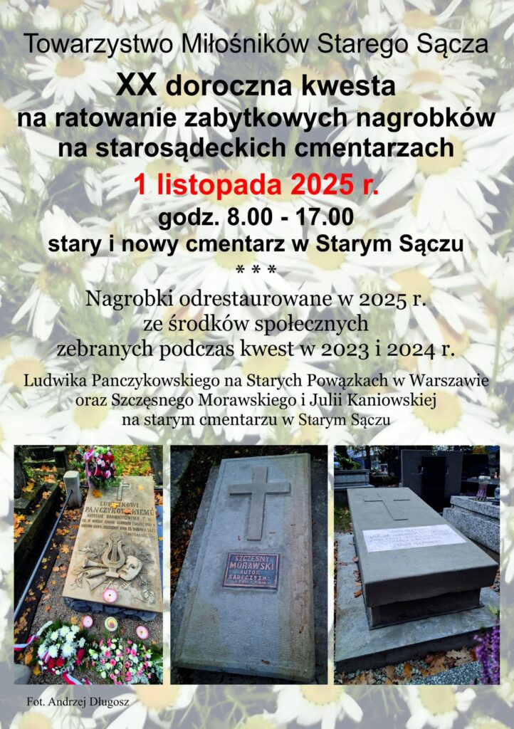 Ze środków społecznych zebranych podczas kwesty w 2024 r. wyremontowaliśmy nagrobki Szczęsnego Morawskiego i Julii Kaniowskiej na starym cmentarzu. Liczymy na wsparcie naszych działań przez starosądeczan i przyjezdnych gości. Za wpłatę każdej wielkości już z góry serdecznie dziękuję. Zebrane kwoty pozwolą na odnowę kolejnych nagrobków, które wytypuje komisja konserwatorska na wiosnę przyszłego roku – powiedział Andrzej Długosz – prezes Towarzystwa Miłośników Starego Sącza.