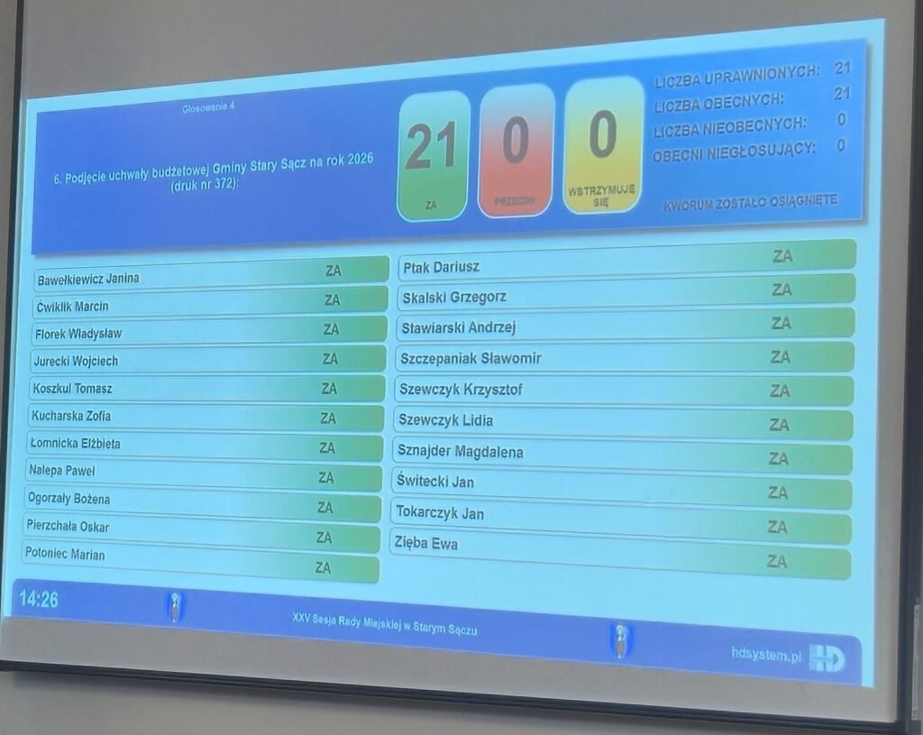 – Dziękuję radnym Rady Miejskiej za odpowiedzialność i współpracę przy podejmowaniu tak ważnej decyzji dla przyszłości naszej gminy. Dziękuję również mieszkańcom za zaufanie i zaangażowanie – to dla Was realizujemy kolejne inwestycje poprawiające jakość życia. Przed nami dalszy rozwój, ponad 42 mln zł na inwestycje i konsekwentna praca na rzecz Starego Sącza – zaznacza.
