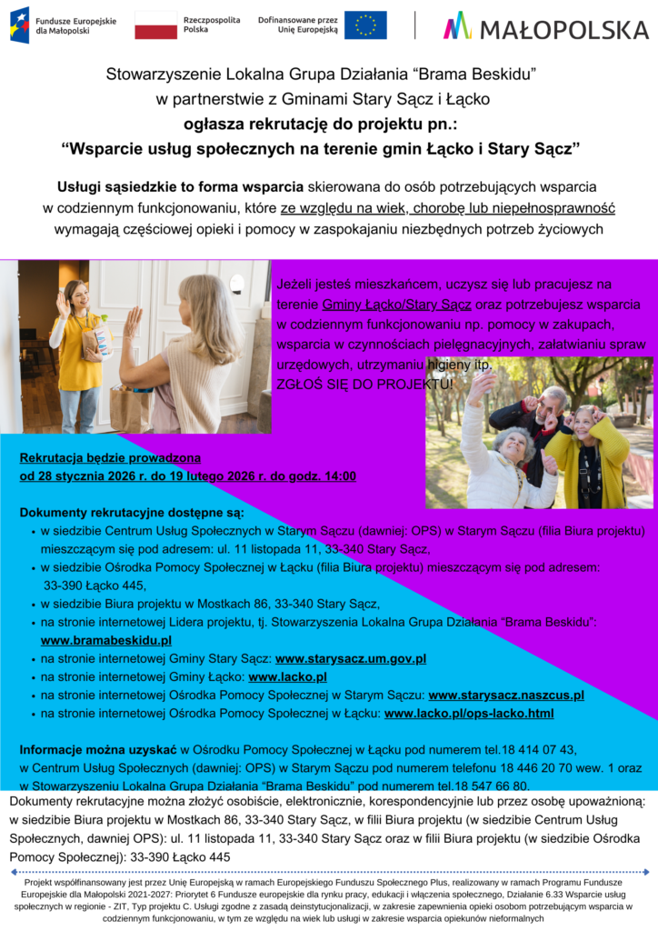 Stowarzyszenie Lokalna Grupa Działania „Brama Beskidu” (Lider projektu) w Partnerstwie z Gminą Stary Sącz i Gminą Łącko (Partnerzy projektu) ogłasza rekrutację do projektu pn. „Wsparcie usług społecznych na terenie gmin Łącko i Stary Sącz”.