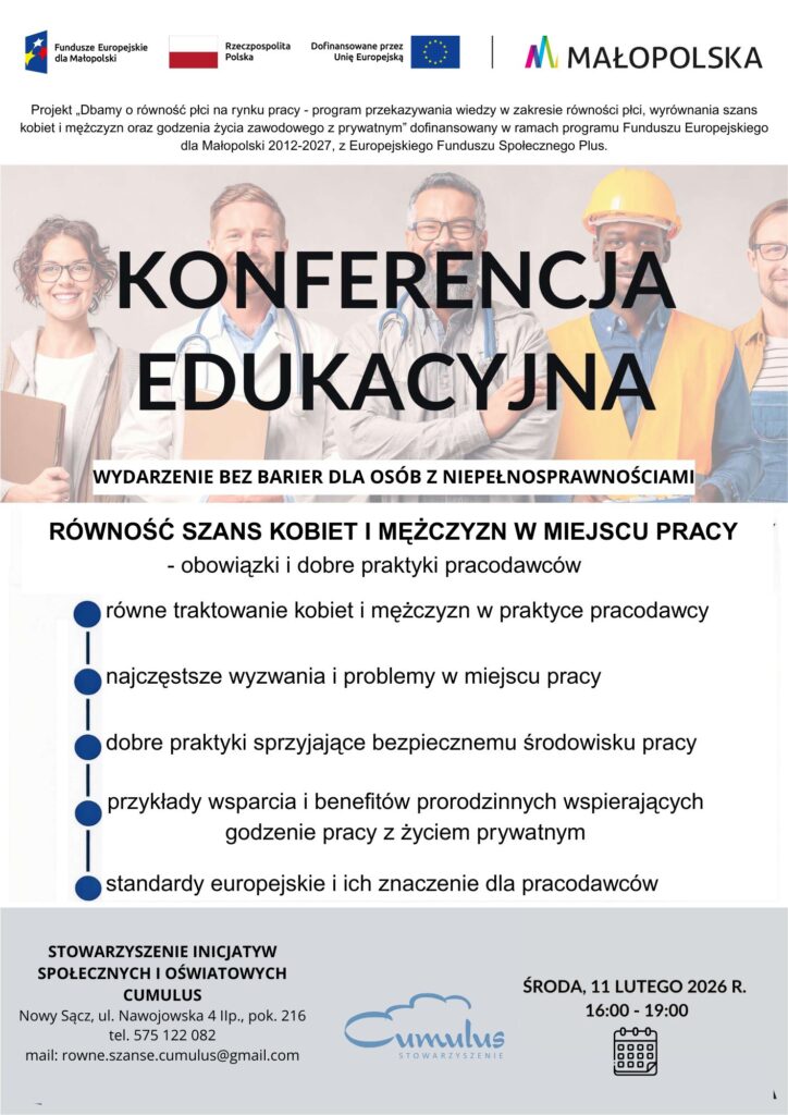 Konferencja realizowana jest przez Stowarzyszenie Inicjatyw Społecznych i Oświatowych CUMULUS w ramach programu „Dbamy o równość płci na rynku pracy – program przekazywania wiedzy w zakresie równości płci, wyrównania szans kobiet i mężczyzn oraz godzenia życia zawodowego z prywatnym” dofinansowanego w ramach programu Funduszu Europejskiego dla Małopolski 2012-2027, Priorytetu 6. Fundusze europejskie dla rynku pracy, edukacji i włączenia społecznego, Działania 6.5 Wsparcie na rzecz równouprawnienia oraz godzenia życia zawodowego z prywatnym, Typ projektu B. Działania mające na celu wzmocnienie równości szans kobiet i mężczyzn, z Europejskiego Funduszu Społecznego Plus.