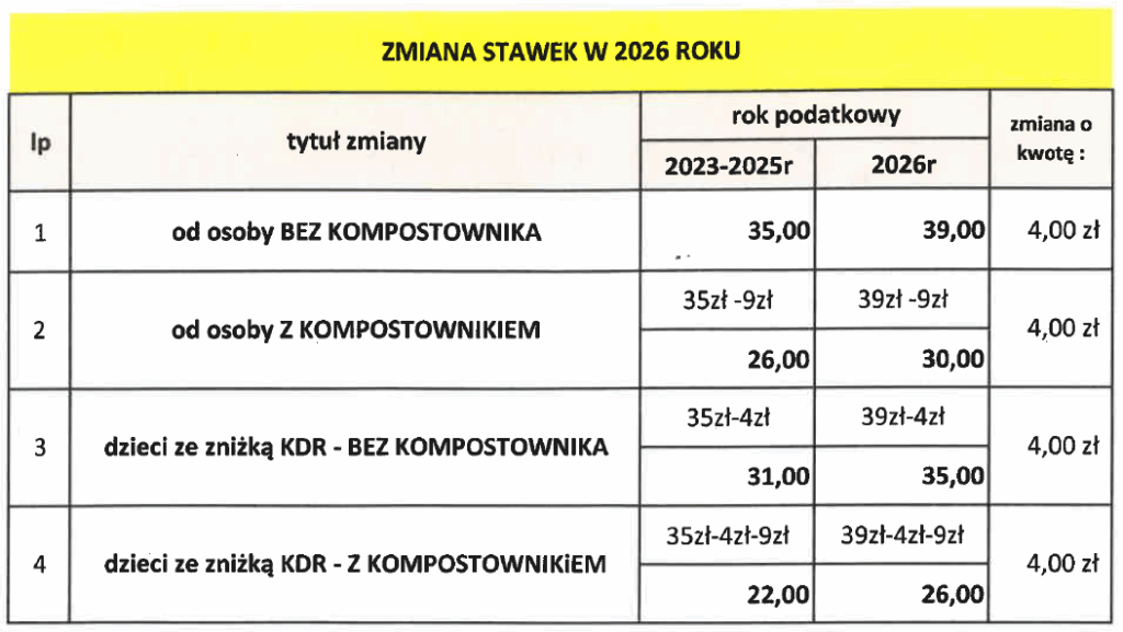 Podstawowa stawka opłaty za gospodarowanie odpadami komunalnymi od właścicieli nieruchomości zamieszkałych w budynkach mieszkalnych jednorodzinnych wynosi miesięcznie 35,00 zł za jednego mieszkańca. Dla właścicieli, którzy śmieci nie segregują stawka wynosi 140,00 zł za jednego mieszkańca.